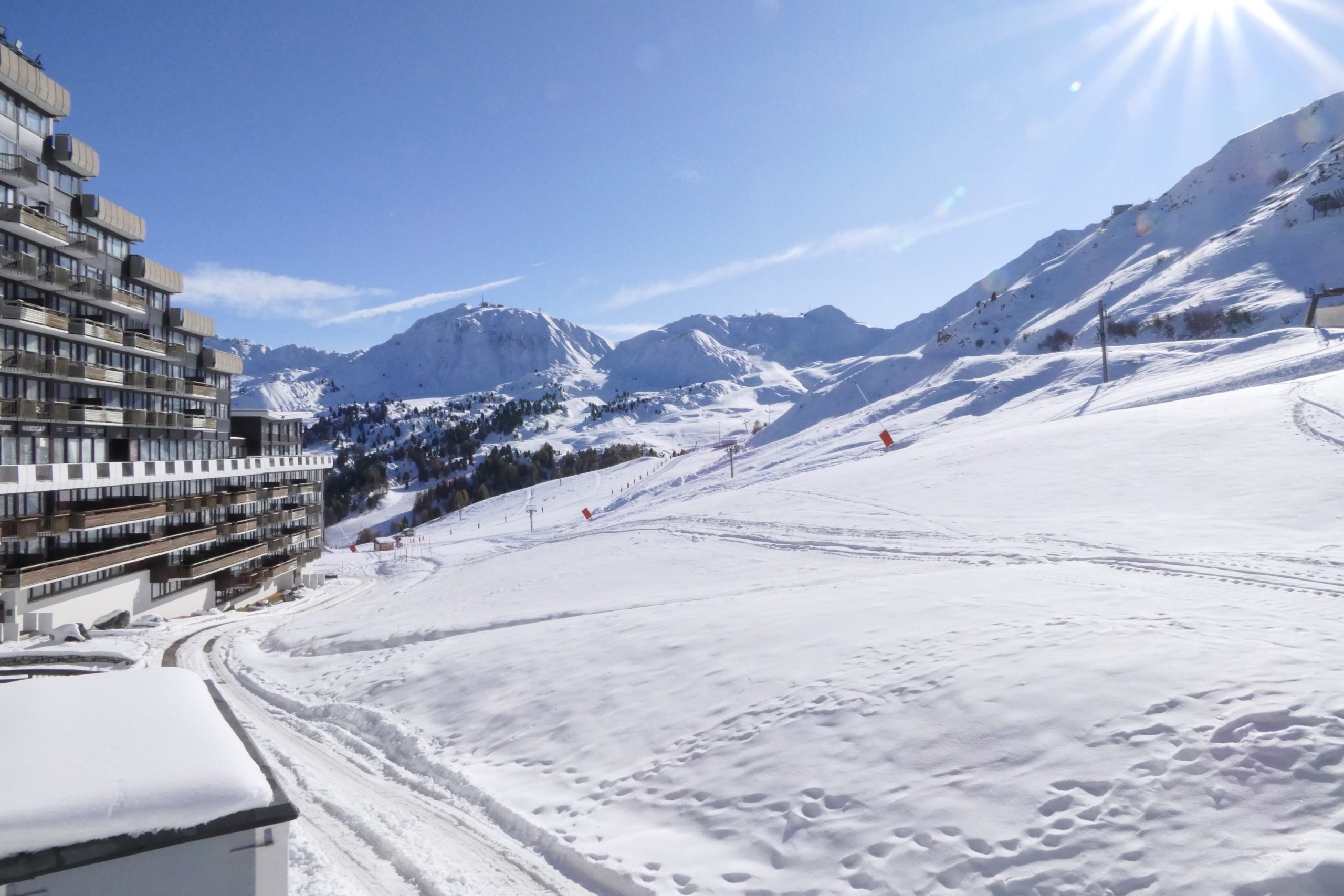 So I legged it down, very happy with the winter walking boots I got half price summer 2018 when I first arrived here. Where I cut off piste bashed snow I could sink in a few inches and a bit did puff up and get into the boots (get gaiters Chris!) but I was generating enough warmth to dry that out fast. I guess 600m or so and a few bends lower and Plagne Centre comes into view. That peak in the distance beyond Plagne Centre is BellecĂ´te and the sadly diminishing local glacier.