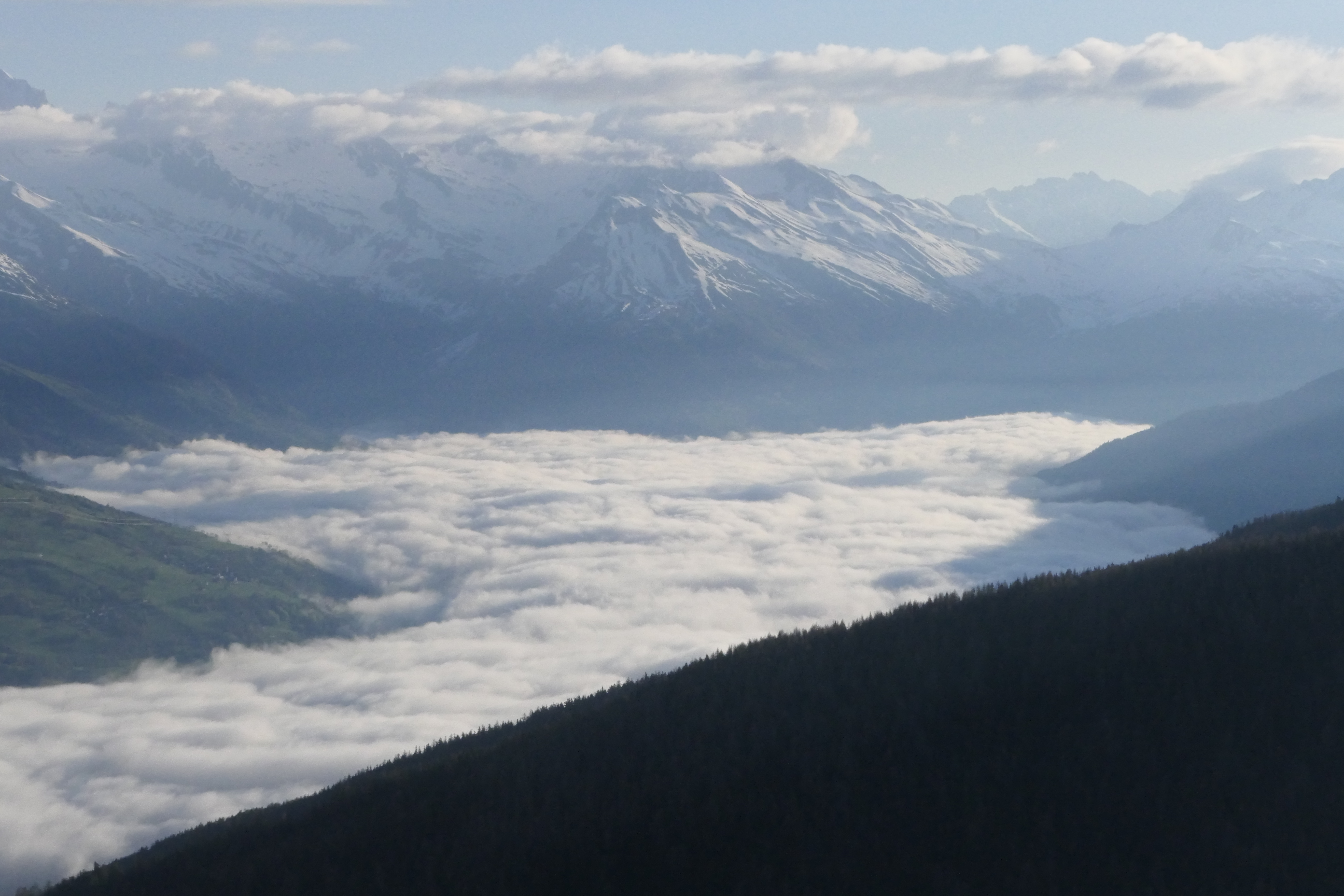 Well these are strange and, for very many, horrible, times. I’m pretty lucky up here, this morning I raised my gaze from the screen to look out, my attention caught by a movement and there was a golden eagle being mobbed first by one of the local alpine choughs and then by two. I grabbed my binoculars and dashed out onto the terrace and for minutes they spiralled above until the eagle I think eventually gave up and disappeared into cumulus really quite high above me. At that point I realised how fast they had been moving both horizontally and vertically, the eagle doing it with very little wing movement while the choughs, little over half the size, flapped more obviously and short in out clearly trying to hit the eagle’s tail and wings while escaping that huge beak. I don’t get that for entertainment in London! I don’t think I’d have got any usable ‘photos had I grabbed the camera rather than the binoculars: it was happening so fast and probably needed a longer lens than the upper end of the “superzoom” I have. Sorry! However, this was a view a couple of hours earlier this morning. I think if you click on it you get the full sized image.