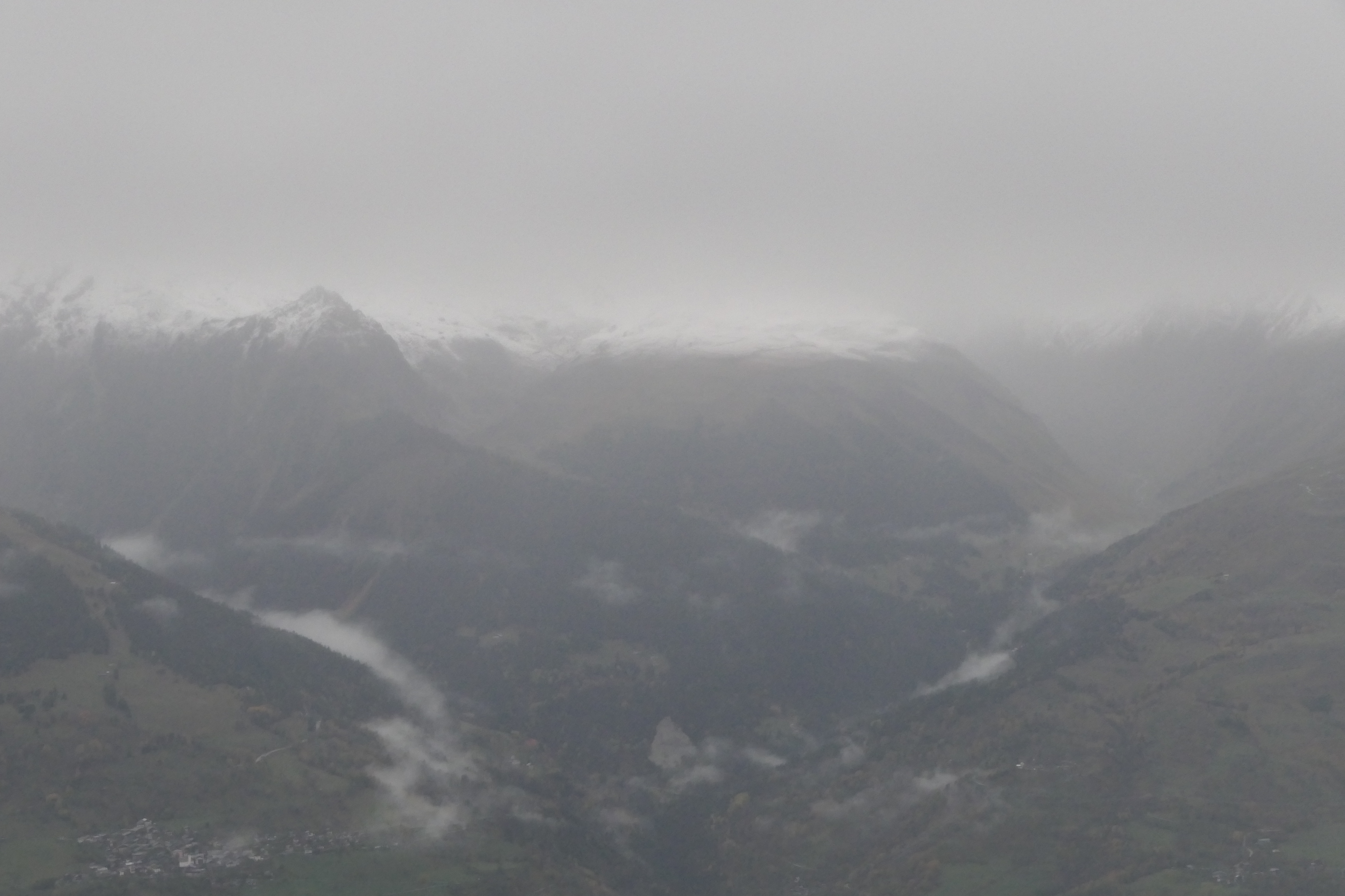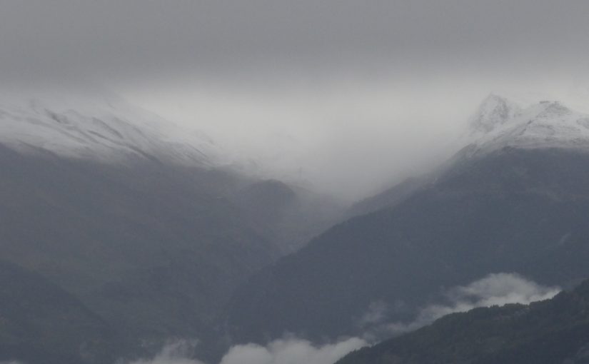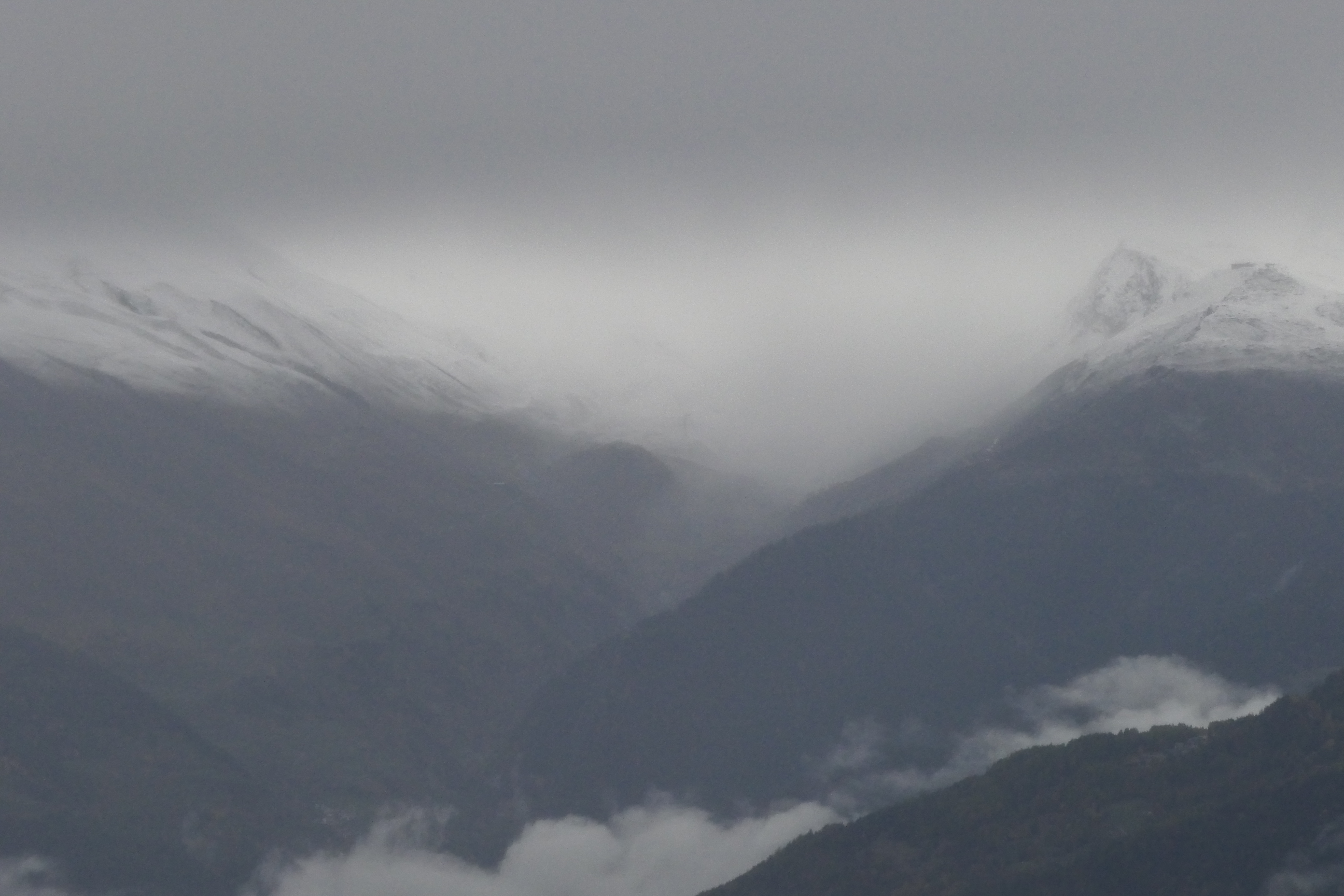 When I got up this morning (3.xi.19) all the higher peaks were covered in snow. For an hour or so I got on with things and just enjoyed the privilege of such a view, then something struck me: it really was so fine that it was why I have a good camera. That view above is a telephoto view away toward the head of the valley. I particularly like that effect when the moisture in the air, and the rather dead, grey light through the thick high snow clouds washes out most colour and turns things into indistinct shapes. Here’s some more of the ‘photos as I pulled a fleece on and stepped out onto the terrace. As usual, click on the images and you should get a larger view and can scroll through them. You should see a short explanatory caption of you hover over an image too.