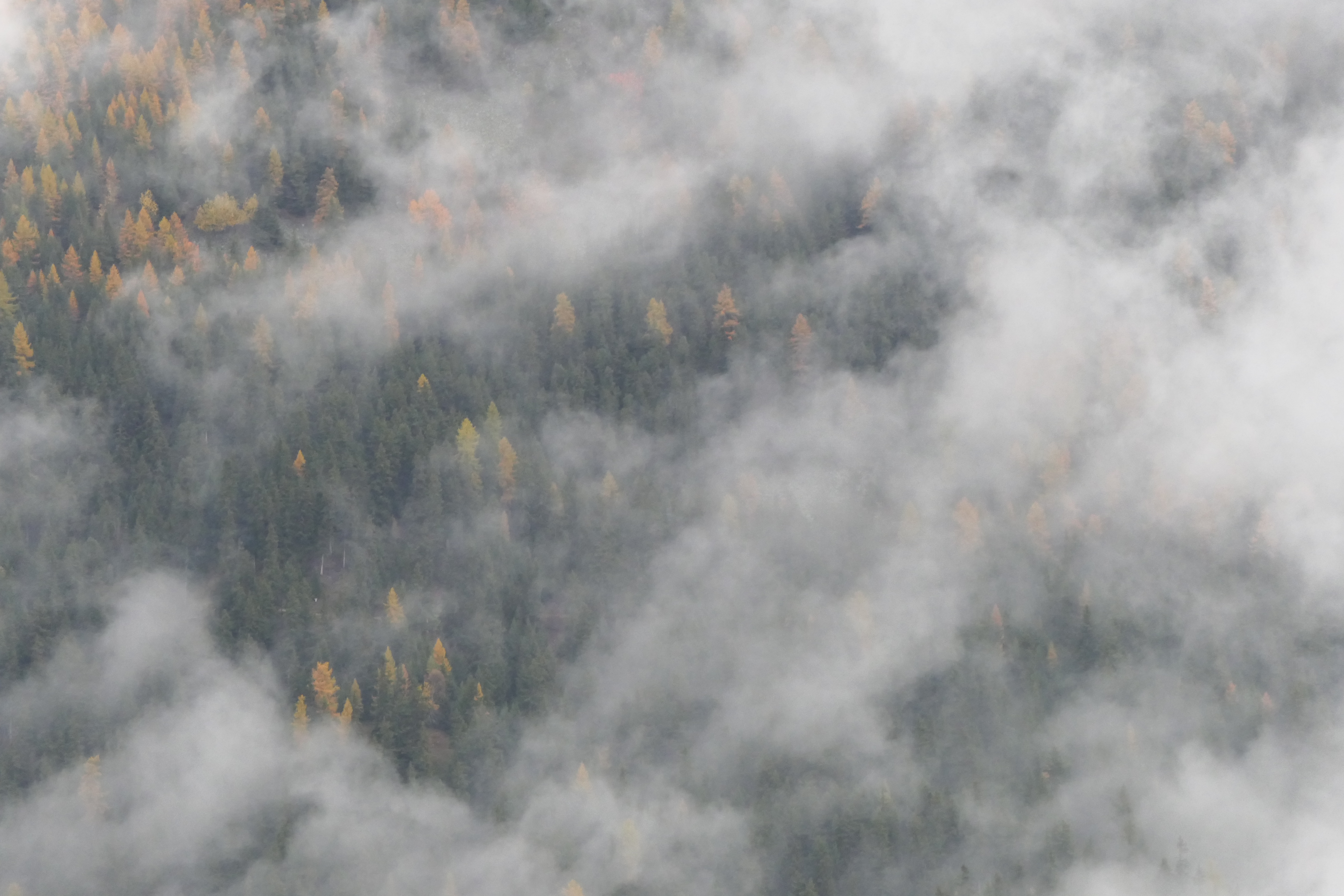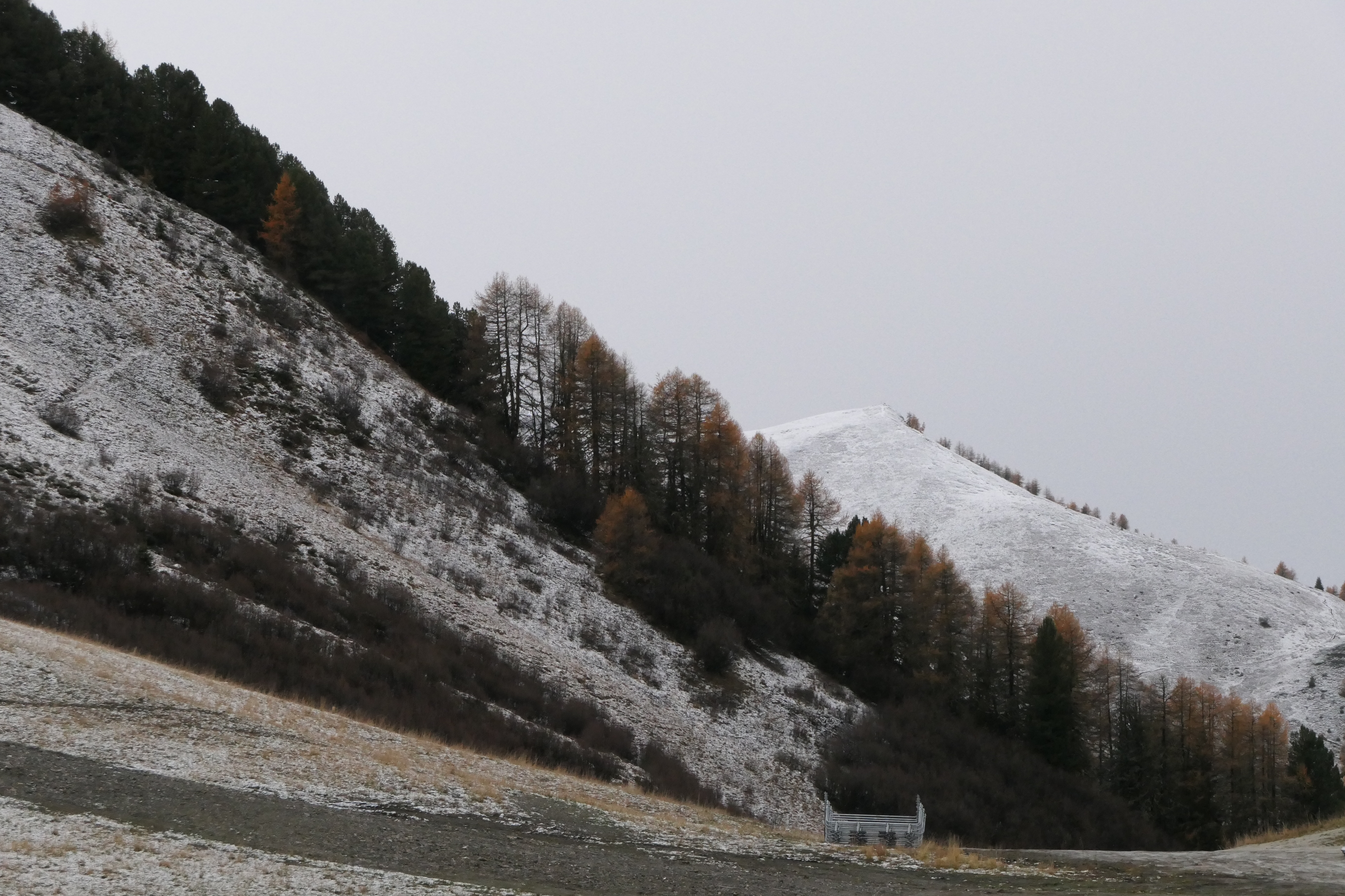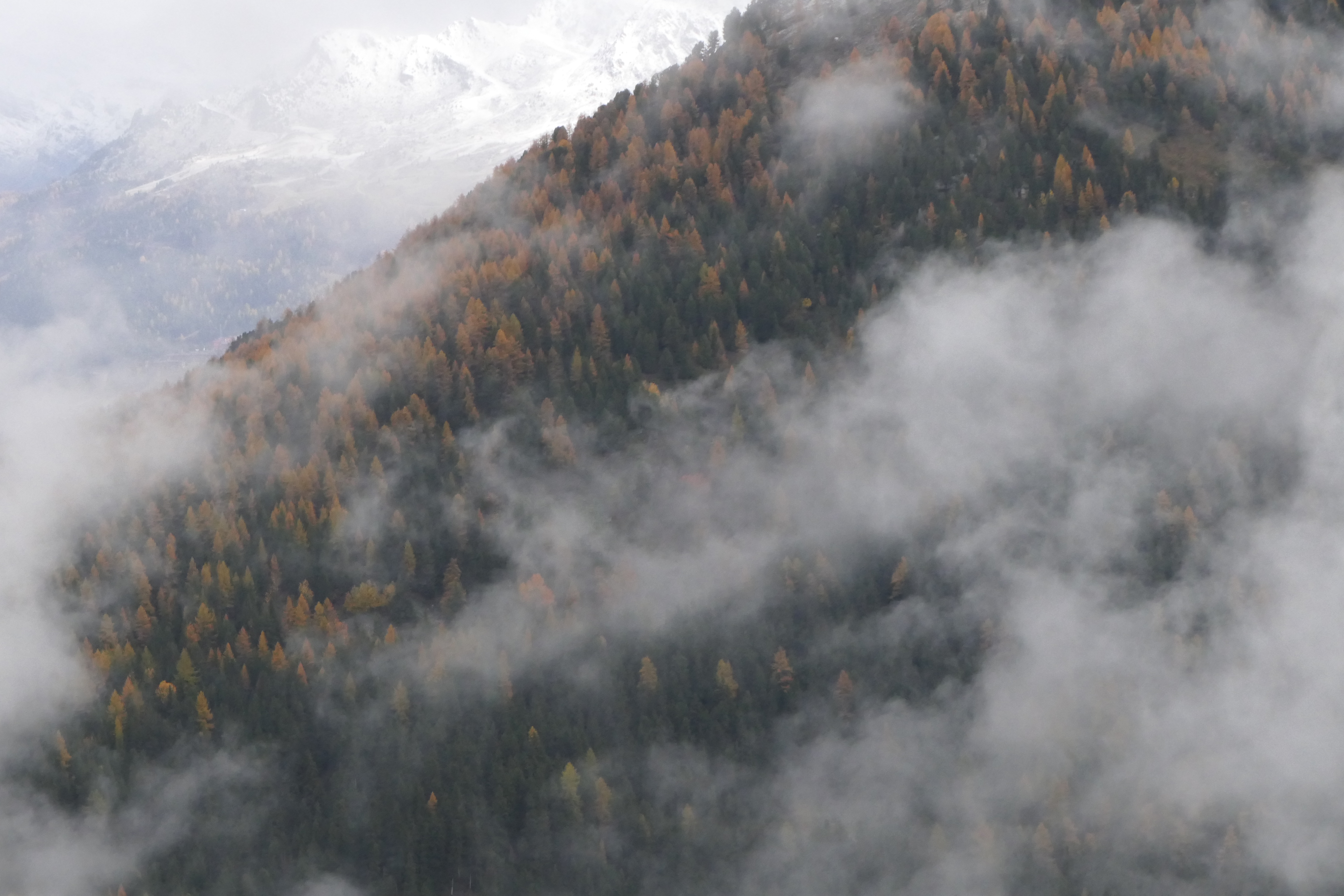 At that point there was a very clear snow line. In the distance it was 500 to 1000m above me I’d guess but looking south there was a light dusting of snow just above me. That meant that our wonderful deciduous conifers were standing out orange and yellow against the clouds and higher snow.