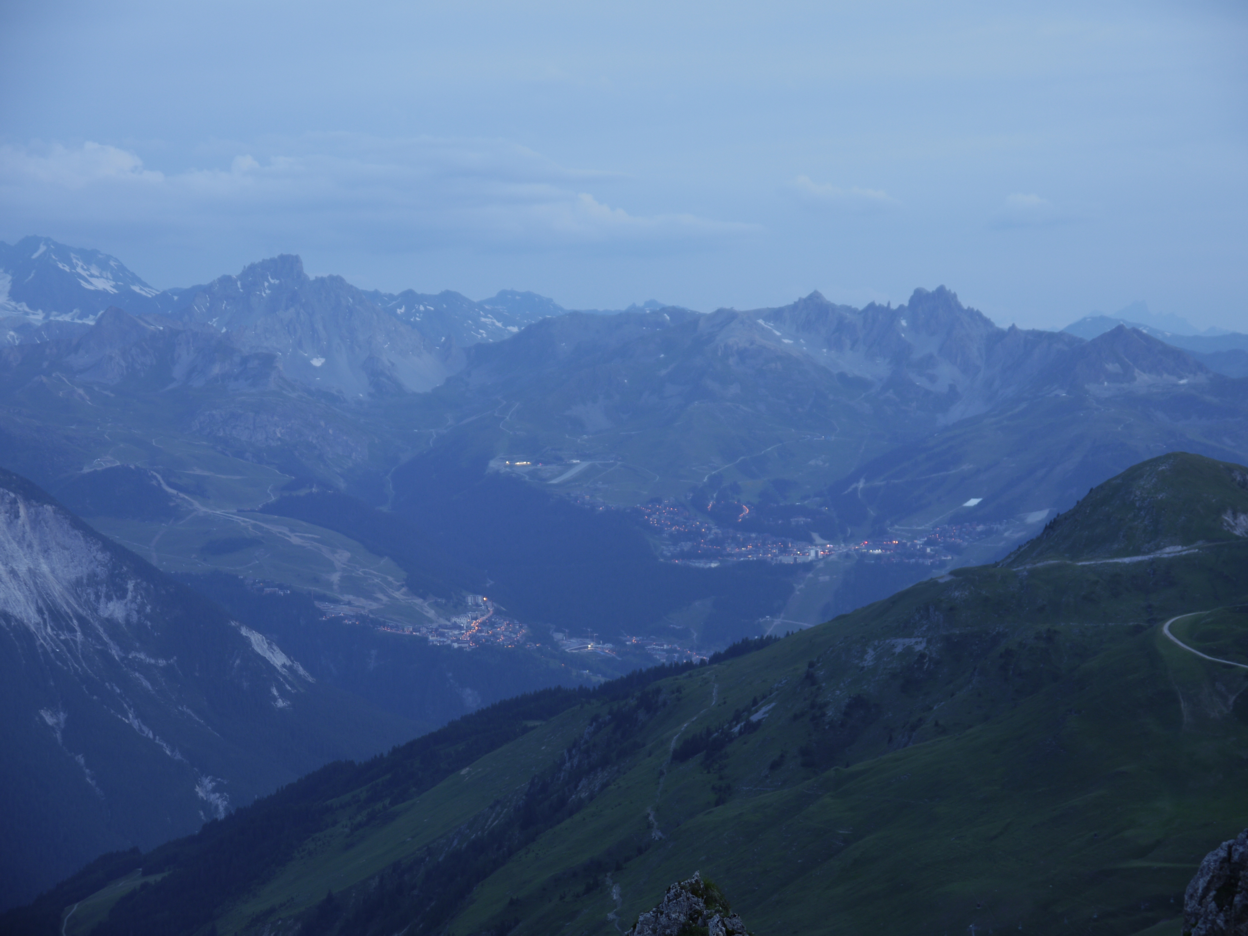 However, I realised that this wasn’t the full eclipse and I also realised it was damn cold. The showerproof but incredibly lightweight top went on and the gloves. But they had to keep coming off to look at the timer or the camera, or a ‘phone. After a bit I consulted the internet (these ‘phones are remarkable aren’t they?) and found a more detailed timing, still for Chambéry but this time marking the point of total eclipse: 22.20. Ouch. I jogged on the spot, I hugged myself. I wondered where everyone else in the world had gone. The moon got darker, and darker and higher, and darker, and yes, it went from pink to red. The sky went black and gradually more and more stars were visible. I never got the milky way proper, but the sheer number of stars was nearing that experience. There was near zero light pollution, I had to go the edge of the track and look SW to see the lights of Champagny and Courchevel beyond. Here they are from another earlier ‘photo before I decided to stop.