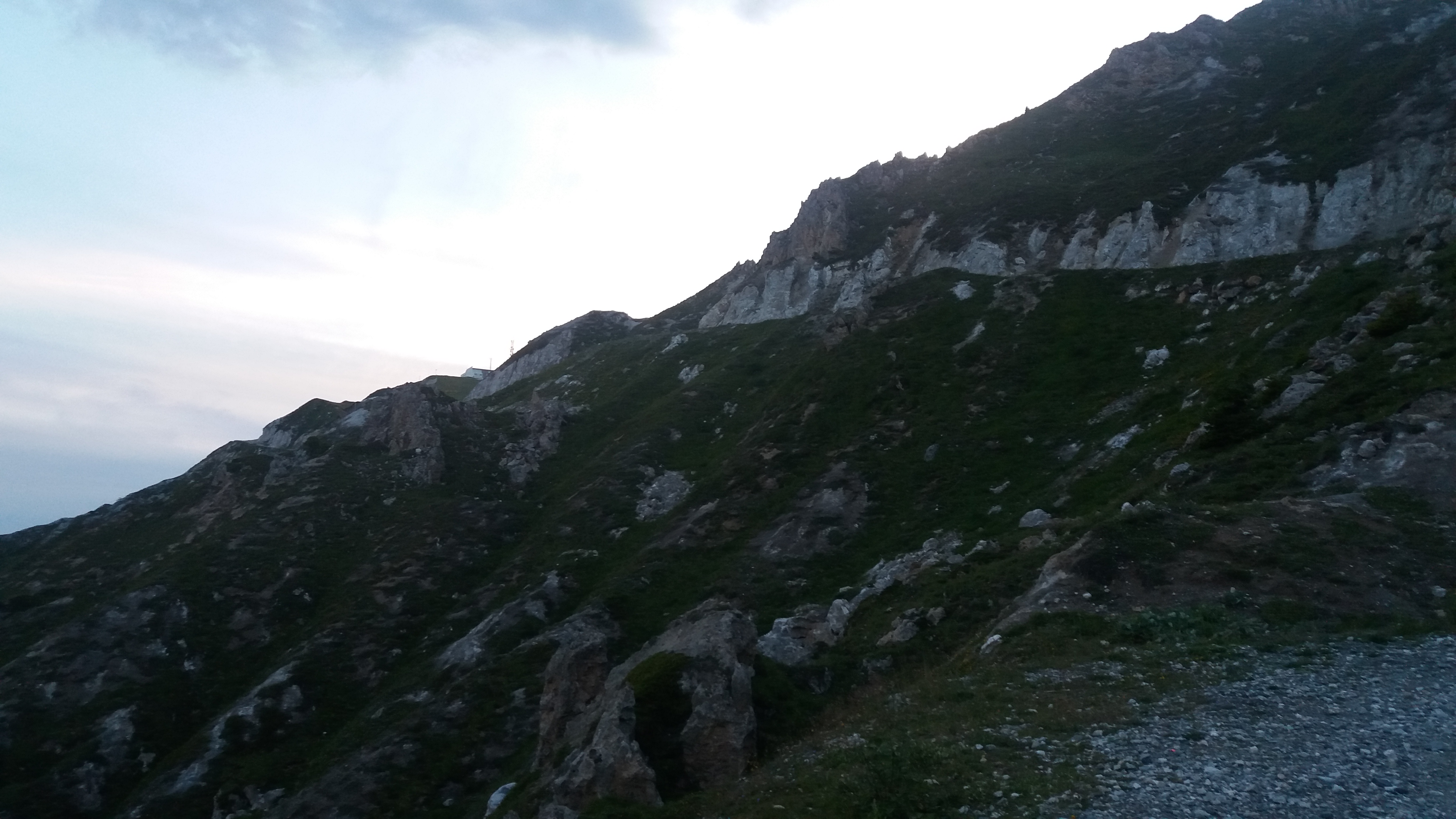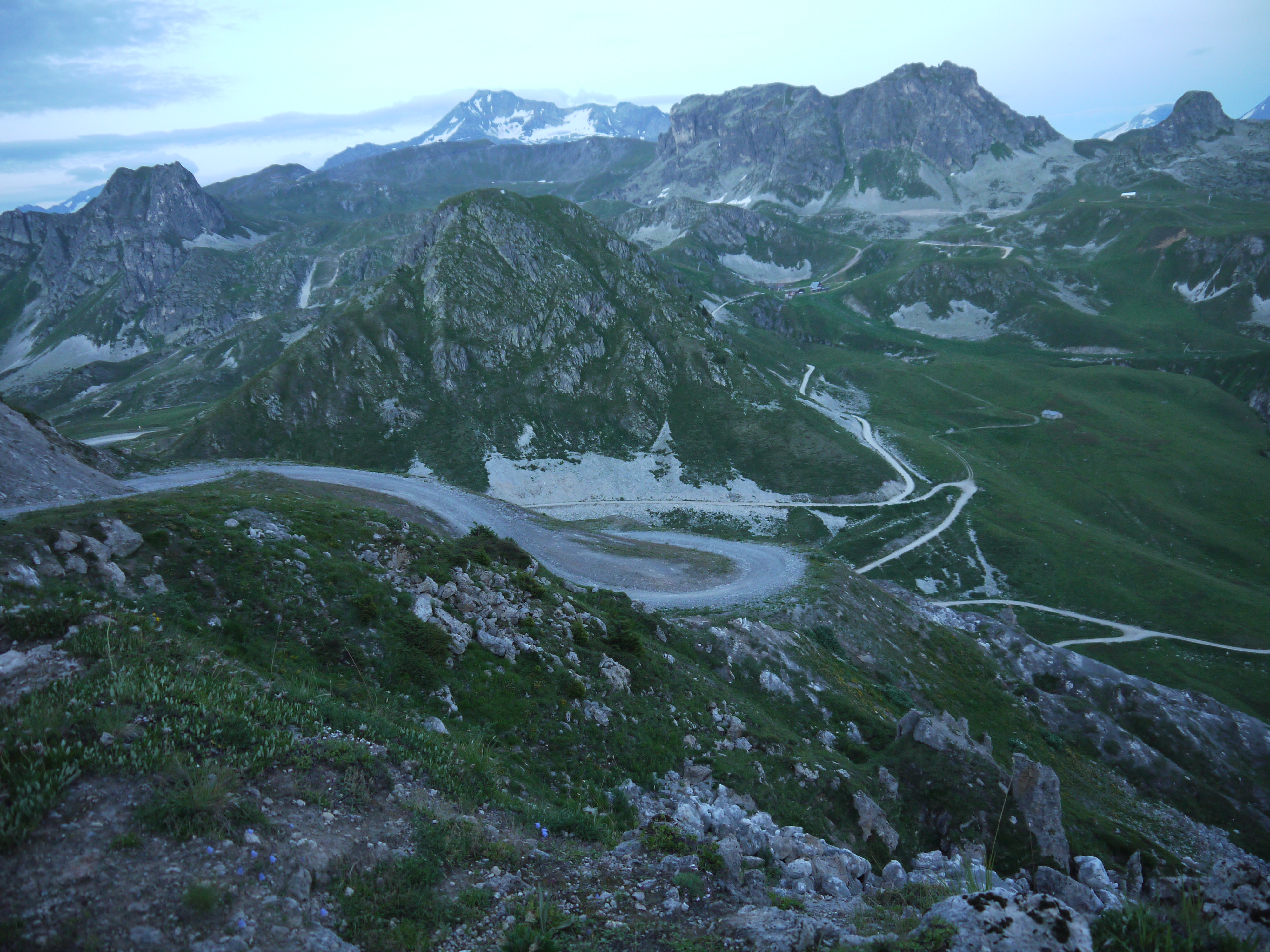 It was rapidly clear that walking and the occasional scoot for the less steep bits was the only way back. Hm, it really was cold though moving helped. Suddenly there was a lump at the edge of the headlight beam and it moved. Too big for fox or marmot … whoa, it was a man, lying down on the edge of the road to watch the moon. I was embarrassed to be causing so much light pollution and and quite rattled. I couldn’t understand his French at all at first but I switched the light off, got my brains back, and we did manage a few sentences. A few hundred metres further it happened again. Well, this time it was less bizarre: this chap was really quite tall and standing, not lying almost lost in the grass and his reflective top revealed him with ten metres to go. However, again my ear/brain for French seemed to have stayed back in Aime 2000 and I was embarrassingly clumsy. Again we agreed the moon, the whole impact on the night, was amazing and wonderful. I said I was cold (apologising to be wimping off without seeing the moon through to her normal state again). He said he too was cold (from what I could see of his clothes, I think he would have been, he seemed to have little more than me.) On I went.