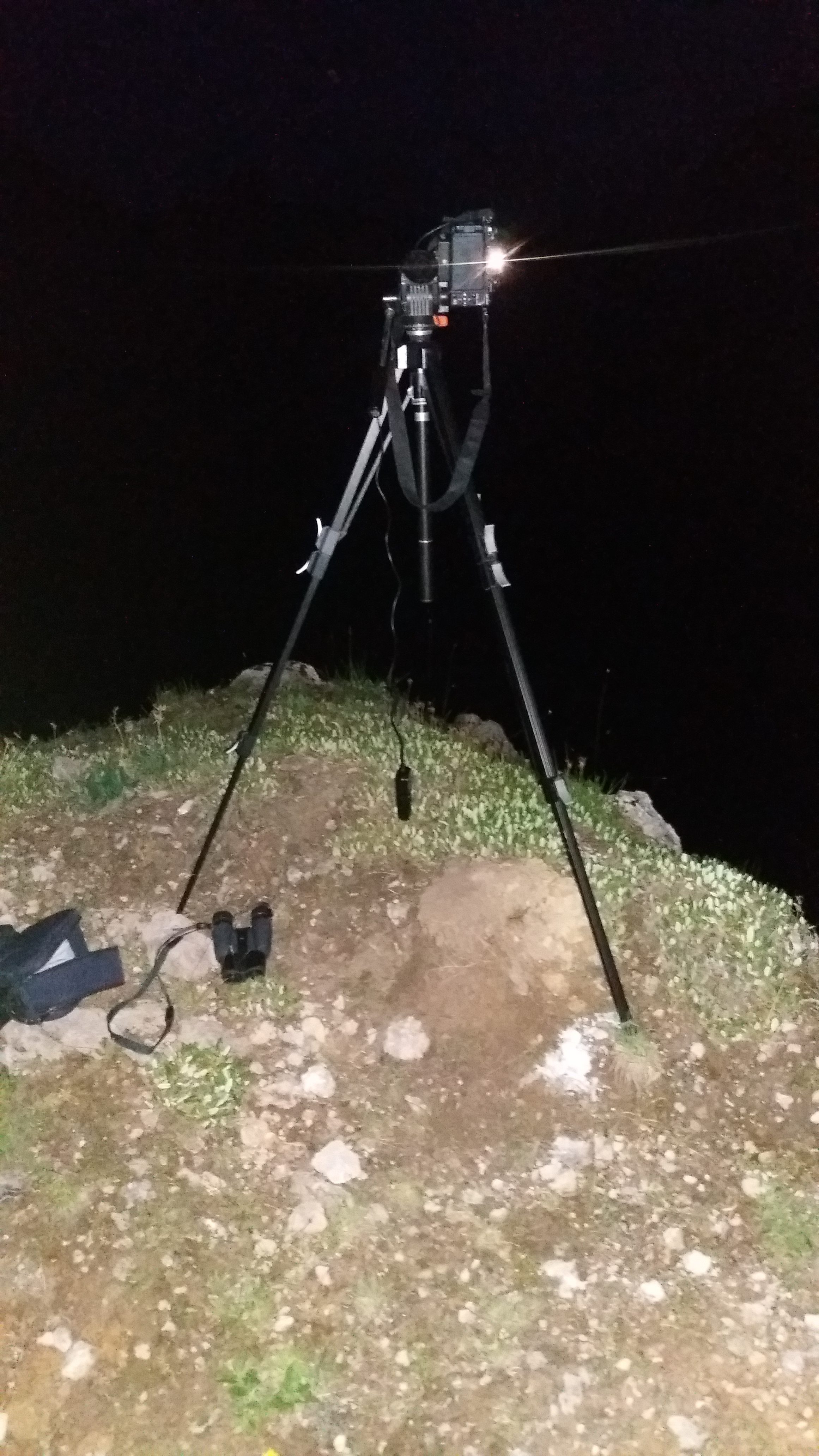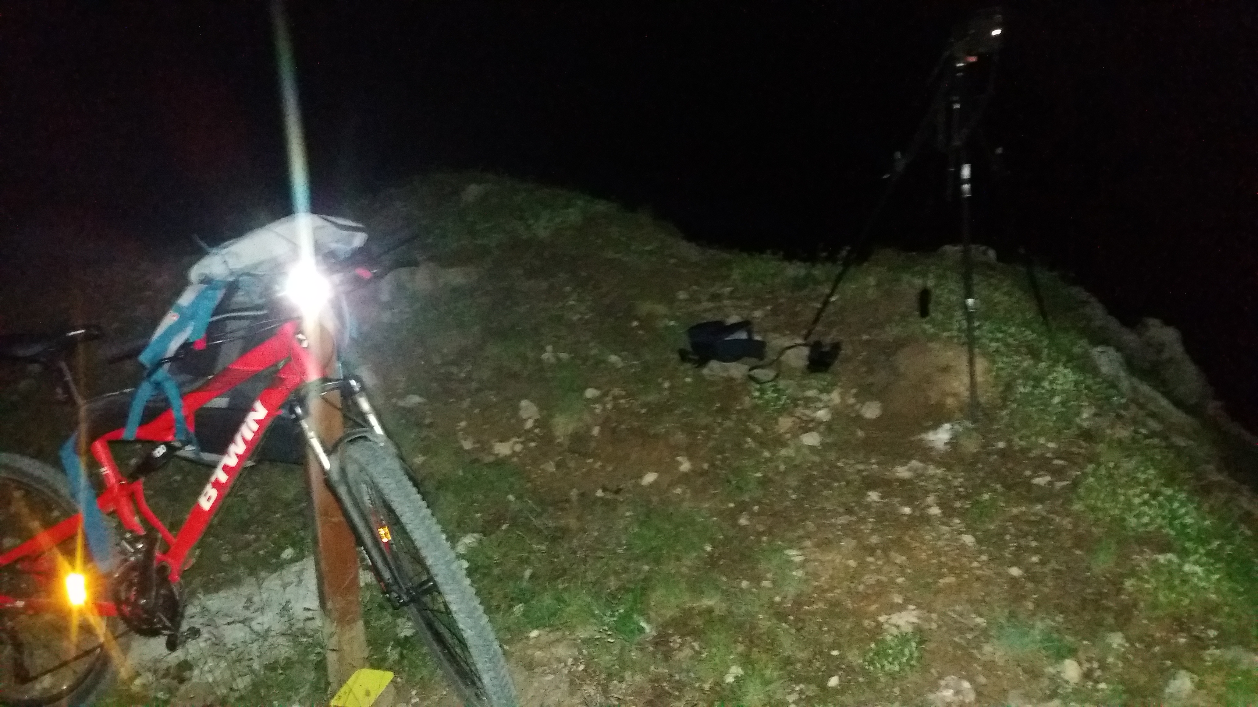 To pass the time I took a ‘photo of the set up. Here’s Cerise leaning on a track side post and demonstrating that her reflectors work very well, and you can make out the tripod on the edge of the drop beyond.