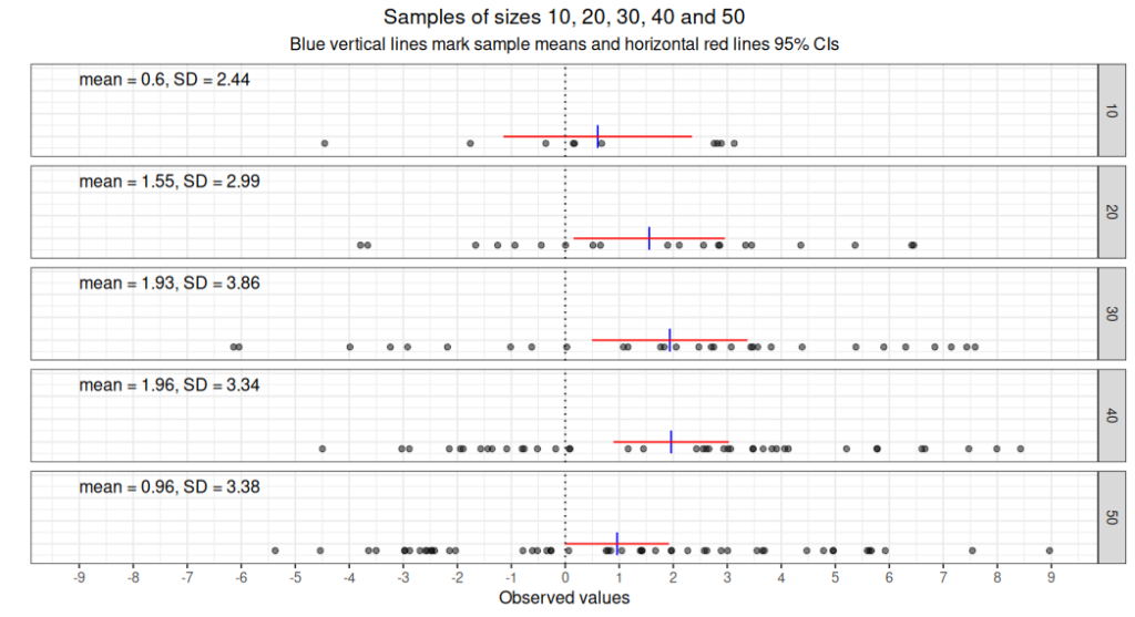As the plot title says these are samples of sizes 10, 20, 30, 40 and 50 and the dots mark the observed values. The sample means and standard deviations are plotted in blue, vertical line for the means and horizontal for the SDs, their values are given in the labels. The labels also show the t values, degrees of freedom (“d.f.”) and the p value for the t-test with these t values and degrees of freedom.