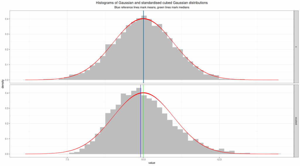 It can be seen there that three central cutting points (lower quartile, median and upper quartile) are almost the same for the Gaussian distribution on the left and the non-Gaussian distribution on the right and that those look pretty equally spaced. It can also be seen that the additional four “whiskers” above and below the box that form this seven number summary are not equally spaced. It can be argued that this makes this a useful enhancement to the five number summary and ordinary boxplot. However, here are the histograms of the same data with the closest fitting Gaussian distributions as red density lines.