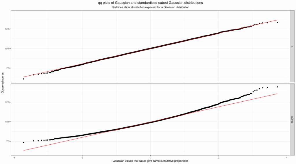 I think that’s a much better way to see the distribution of the data and to see that the second dataset clearly doesn’t fit a Gaussian distribution whereas the first looks like very close fit to Gaussian. The qq plot is an even better way to detect deviation from Gaussian distribution by eyeballing a plot as this next plot shows.
