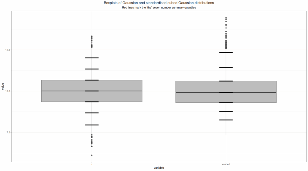 This seven number summary splits a distribution into eight score ranges. The cutting points here are “2.15%”, “8.87%”, “25%”, “50%”, “75%”, “91.13%” and “97.85%”, so as proportions those are 0.0215, 0.0887, 0.25, 0.5, 0.75, 0.9113 and 0.9785. The logic is that if the distribution is Gaussian those points would be about equally spaced across the range of the scores. Apparently it was associated with a box plot with extra “whiskers”. Here’s an example for 5,000 values of a Gaussian distribution with mean 1.0 and SD 1 and the cubes of those numbers transformed to re-centre then on 1.00 and to have an SD again of 1.0.